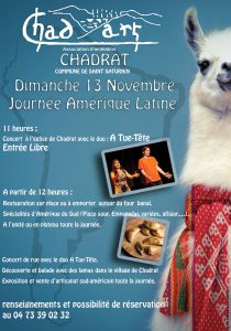 Concert de rue avec le duo A Tue-Tête. Découverte et balade avec des lamas dans le village de Chadrat Exposition et vente d’artisanat sud-américain toute la journée.